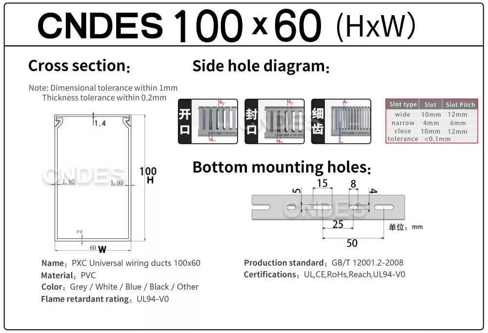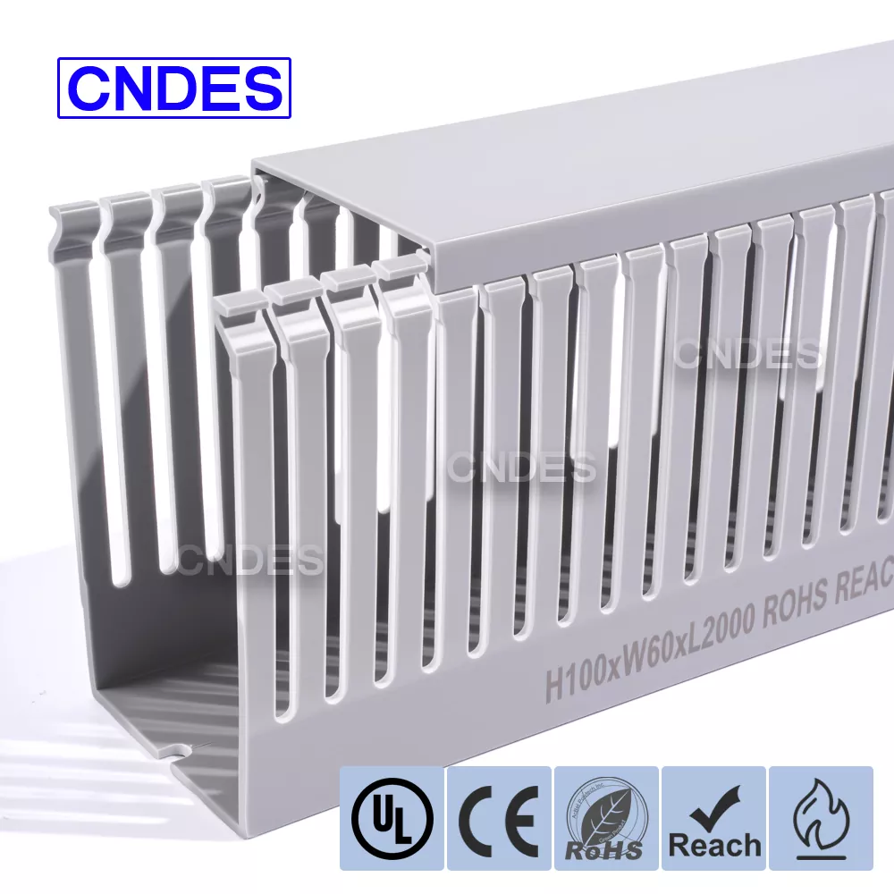 Presná drážka – presné drážkovanie – kvalitný 100×60 PVC kanál pre elektrické panely má jednotný dizajn drážky, ktorý umožňuje čistý výstup káblov z akejkoľvek polohy; vlastné vzory otvorov sú k dispozícii ako voliteľné príslušenstvo..