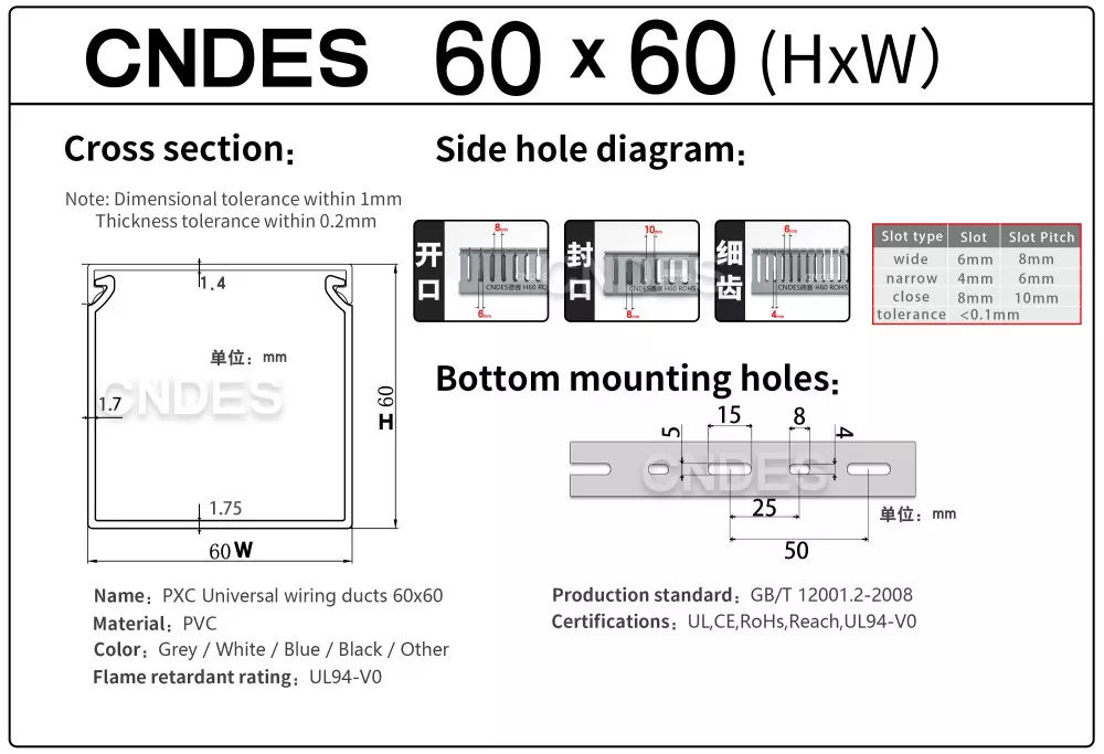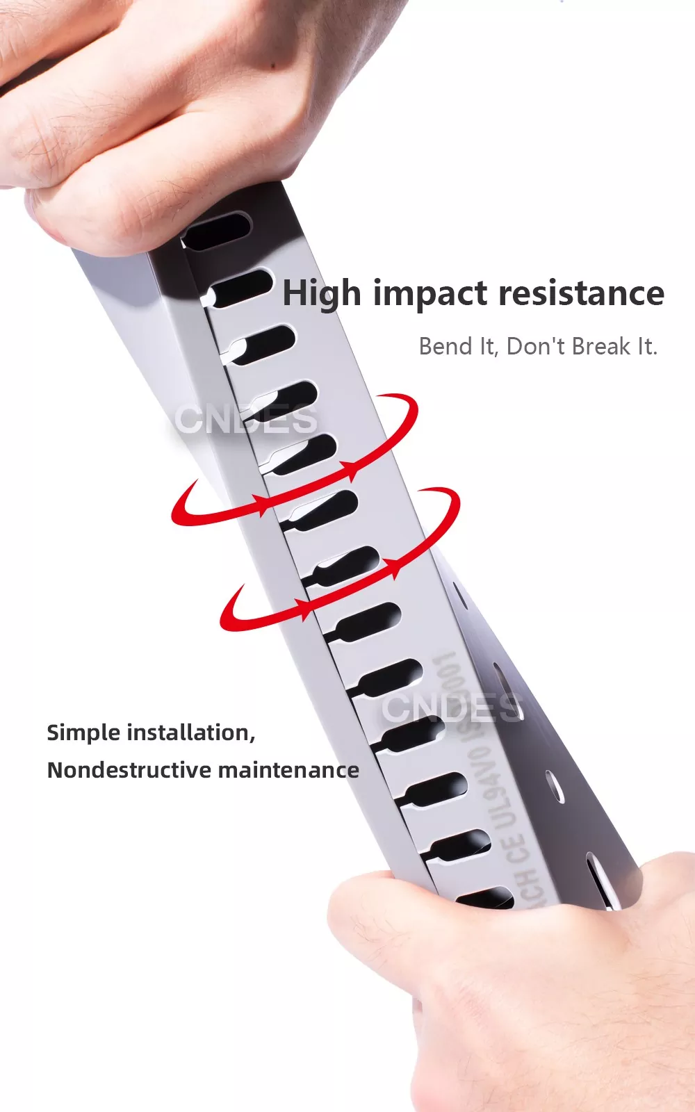Káblový kanál CNDES Control Cabinet je vyrobený z patentovaného PVC vzorca. Drážkovaný PVC ovládací skriňový kanál je ekologický, spomaľuje horenie a je odolný proti nárazu a vydrží opakované ohýbanie o 180° bez toho, aby sa zlomil.