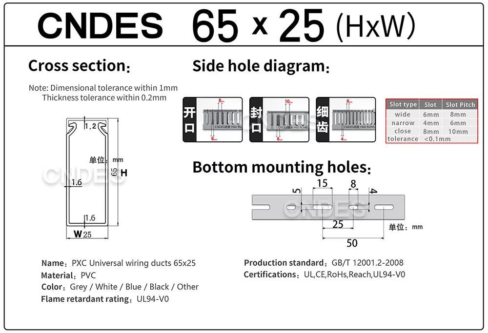 CNDES' Customized 65×25 Cable Tray Ducts je tenký profilový kanál na vedenie káblov vyrobený z pevného PVC. Používa sa hlavne na vedenie a ochranu káblov v oblastiach, kde: