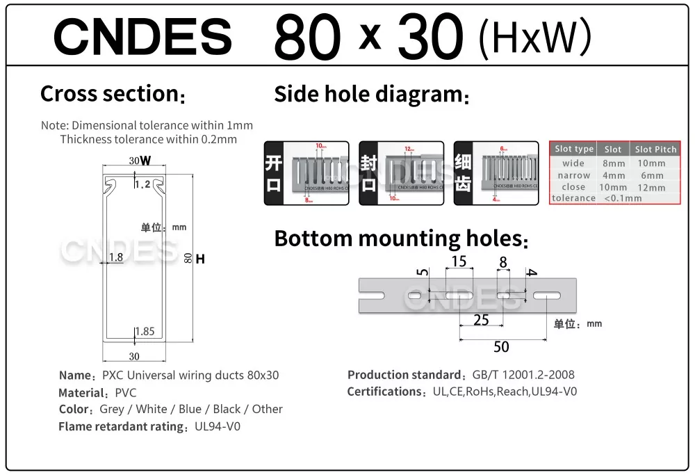 CNDES je dôveryhodný výrobca a dodávateľ káblových žľabov z PVC v Číne. Zabezpečujeme stabilnú kvalitu produktu, presné rozstupy medzi štrbinami a súlad s normami UL, CE, RoHS a REACH, ktoré sú vhodné pre domáce aj medzinárodné projekty.