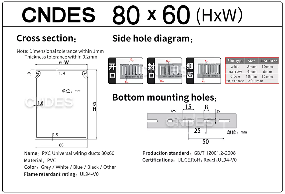 CNDES je popredným výrobcom a dodávateľom štrbinových PVC káblových kanálov uvedených na zozname UL s konkurenčnými výrobnými cenami! Tento prispôsobený štrbinový PVC káblový kanál s rozmermi 80 × 60 má rovnomerne rozmiestnené otvorené štrbiny na oboch stranách pre rýchle vedenie káblov, závitovanie a budúcu údržbu. Rozšírené okraje štrbín zvyšujú tuhosť konštrukcie a zároveň rozširujú kapacitu kábla. Zaoblené hrany zabraňujú poškodeniu izolácie ruky alebo drôtu počas inštalácie. Drážkovaný PVC káblový kanál uvedený v UL obsahuje protišmykové kryty, ktoré zaisťujú bezpečné uzavretie a zabraňujú náhodnému otvoreniu.