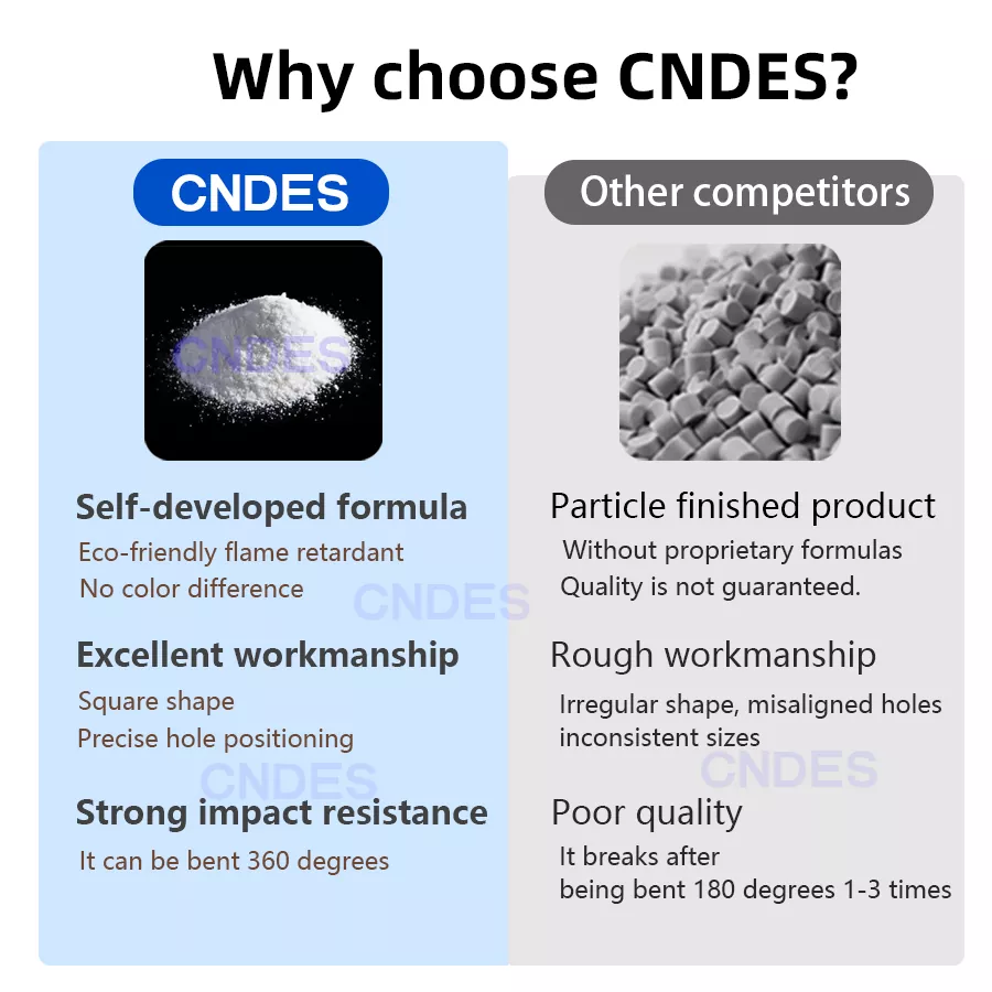 Naša receptúra je šetrná k životnému prostrediu a odolná voči ohňu. Zabezpečuje žiadne farebné variácie medzi rôznymi šaržami a zachováva silné fyzikálne vlastnosti našich káblových kanálov, čo im umožňuje vydržať opakované ohýbanie o 180° bez toho, aby sa zlomili.
